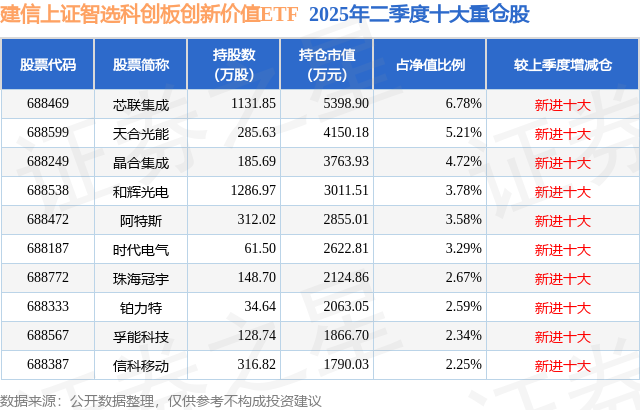 根据2025基金半年报公募基金重仓股数据,重仓该股的公募基金共4家,其中持有数量最多的公募基金为建信基金的建信上证智选科创板创新价值ETF。建信上证智选科创板创新价值ETF目前规模为7.97亿元,最新净值1.3733(10月9日),较上一交易日上涨2.92%。该公募基金现任基金经理为张溢麟。张溢麟在任的基金产品包括:建信民丰回报混合,管理时间为2023年1月4日至今,期间收益率为5.68%;建信双债增强债券A,管理时间为2024年6月27日至今,期间收益率为5.81%;建信上证智选科创板创新价值ETF联接A,管理时间为2025年6月20日至今,期间收益率为20.79%。