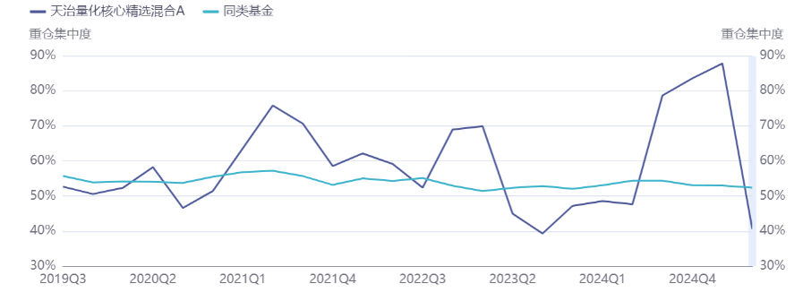 除了行业之外,个股的集中度也非常高。据iFind数据显示,天治量化核心精选混合的前十大重仓股占比长期高于50%,且大幅高于同类平均水平。