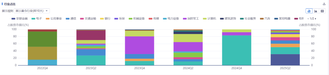 今年上半年押宝券商和电子,2024年4季度押宝电子(占基金净值比高达76.23%),2024年上半年押宝军工、计算机和机械设备,2023年下半年押宝军工(占基金净值比高达45.20%)
