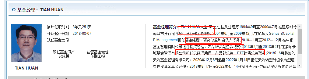 而首任基金经理tian huan,在加入天治基金之前,曾在景顺长城基金担任总经理助理、产品部总监、ETF销售总监等职,也算是身兼要职。