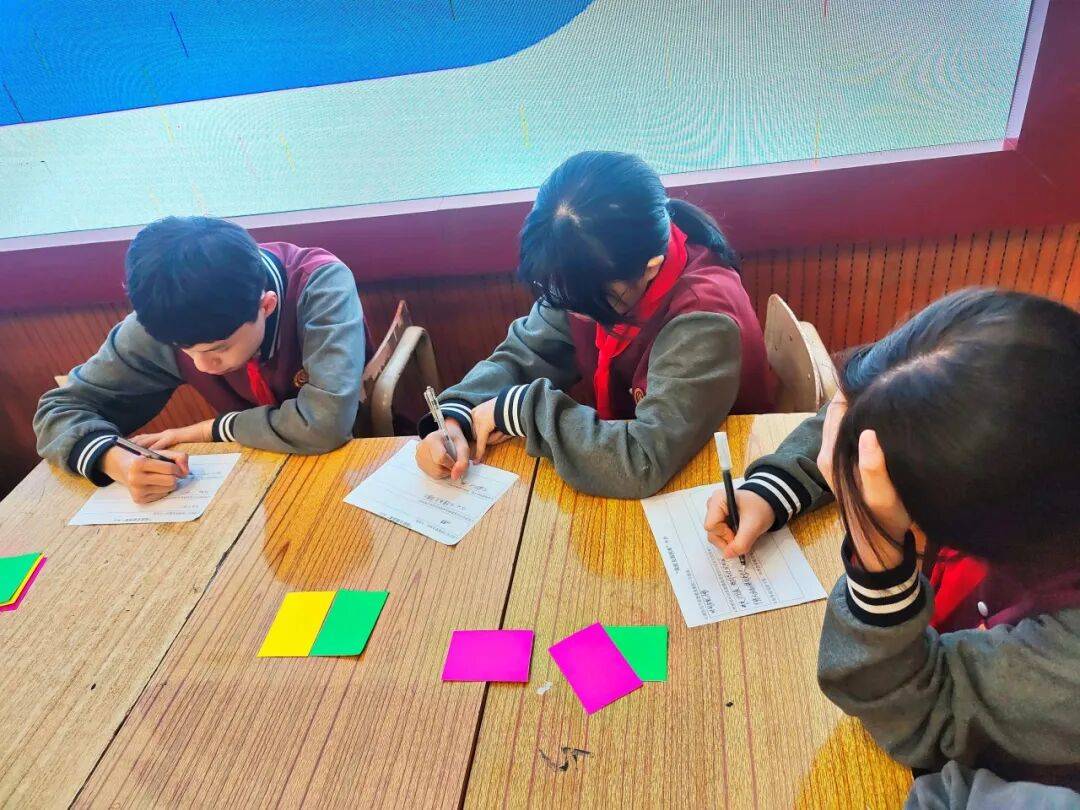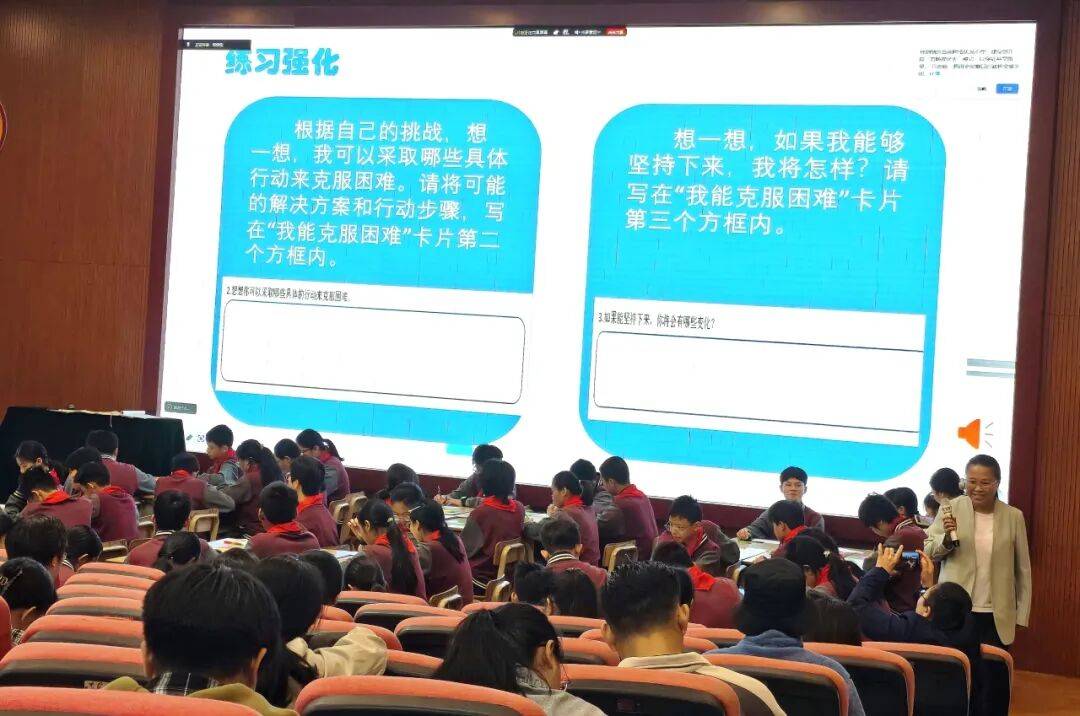 课堂伊始,在主题导航环节,同学们在我能克服困难卡片上线班的同学们坦诚分享、用心倾听,迅速营造出安全信任的课堂氛围。