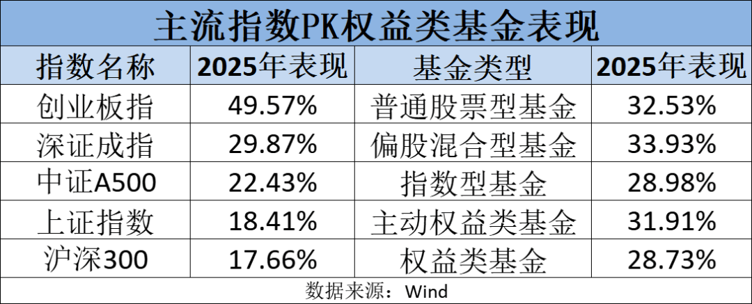 Wind数据统计,若不计算2025年成立的新基金,2025年权益基金整体获得28.73%的净值增长率(包括指数型、混合型、股票型,不含FOF,仅算主代码),表现明显好于上证指数。