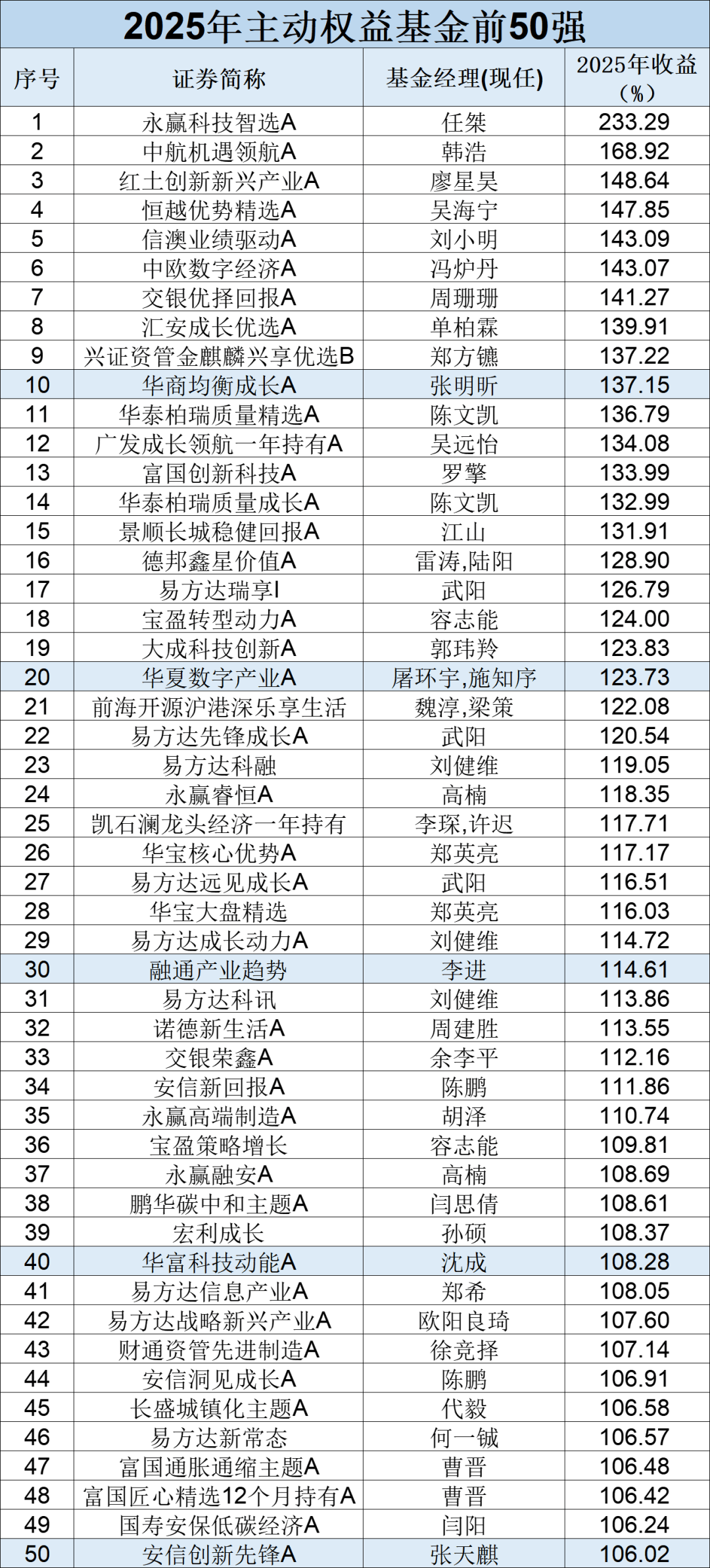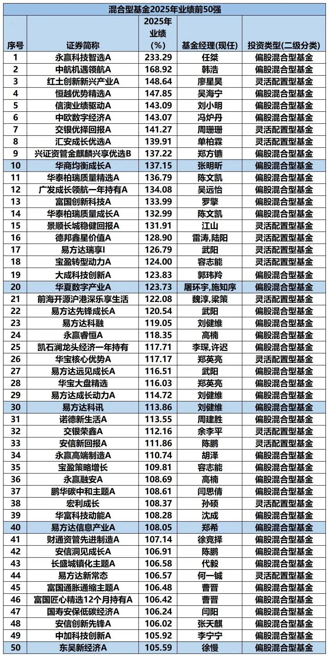 2025年,混合型基金平均斩获26.79%的单位净值涨幅,排名前50的混合型基金均是年度“翻倍基”。