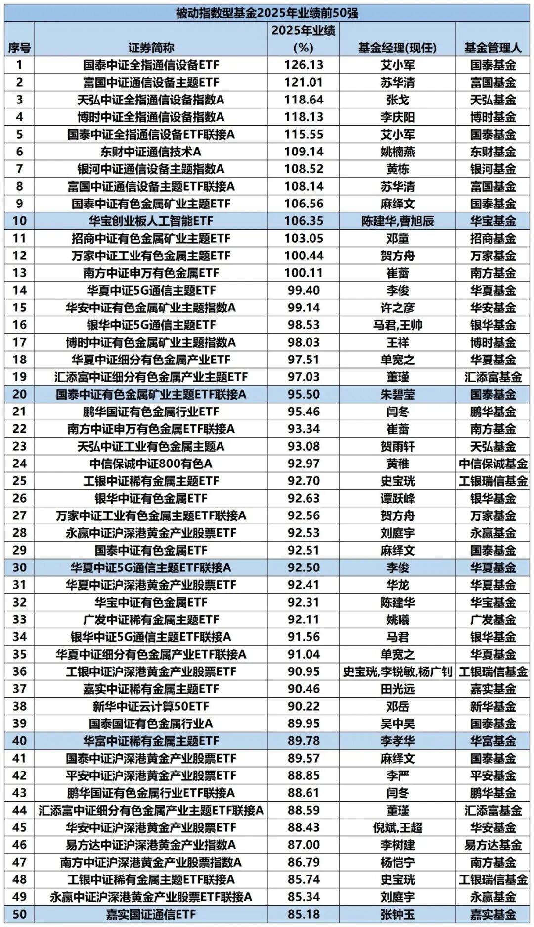 在2025年净值增长率前10只被动指数型基金中,和通信设备相关的产品“霸屏”。其中,国泰中证全指通信设备ETF2025年业绩高达126.13%,位居被动指数型基金业绩第一。