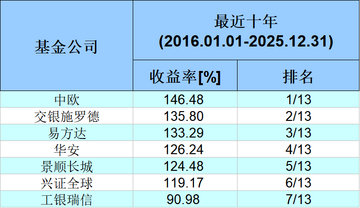 信达澳亚基金紧随其后,以270.88%的单位净值涨幅排名第二;华商基金则以185.80%的收益率位列第三;大成、万家、国寿安保、红土创新等基金公司最近十年业绩也都超过170%。