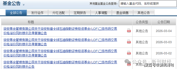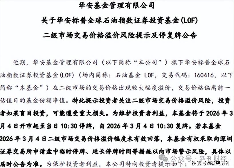 为维护投资者利益,警示高溢价投资风险,华安石油基金LOF连续公告实施临时停牌措施,包括在3月2日至3月4日期间,自当日开市起至10:30实施临时停牌,10:30准时复牌。同时公告还强调,若2026年3月4日二级市场交易价格溢价幅度未有效回落,基金管理人有权采取向深圳证券交易所申请盘中临时停牌、延长停牌时间等措施以向市场警示风险。