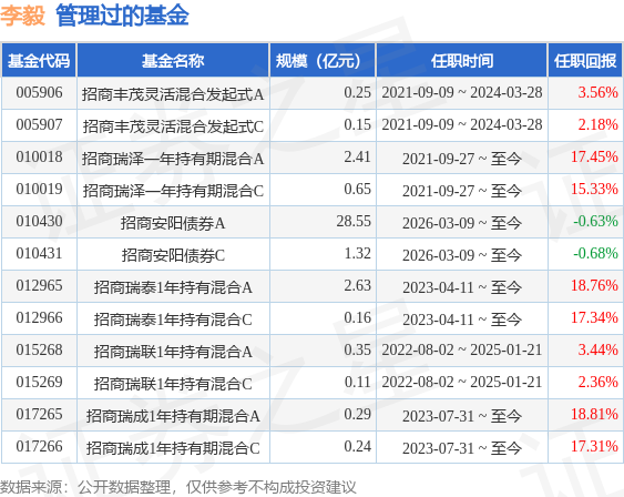 2026-04-17多宝体育,多宝体育官方网站,多宝体育APP下载证券之星消息,2026年4月17日,招商瑞智优选混合(LOF)(场内简称:招商优选LOF)(161728)发布公告,增聘李毅为基金经理,任职日期自2026年4月17日起,李崟不再担任该基金基金经理,离任日期为2026年4月17日,变更后招商瑞智优选混合(LOF)(场内简称:招商优选LOF)(161728)的基金经理为李毅。截止2026年4月16日,招商瑞智优选混合(LOF)(场内简称:招商优选LOF)净值为1.6185,较上一日上涨0.53%,近一年上涨51.5%。
