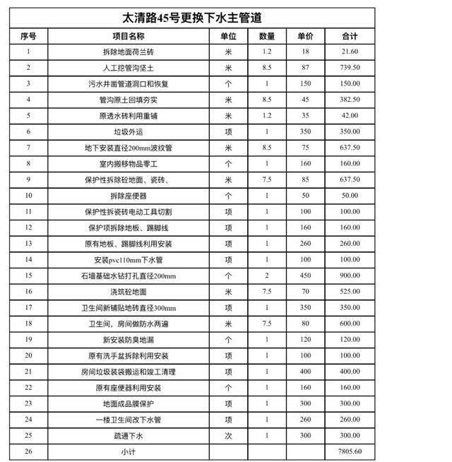 通过张先生提供的《太清路45号更换下水主管道》方案,记者可以看到,其中整修施工明细共有25项,共计费用7805.6元。