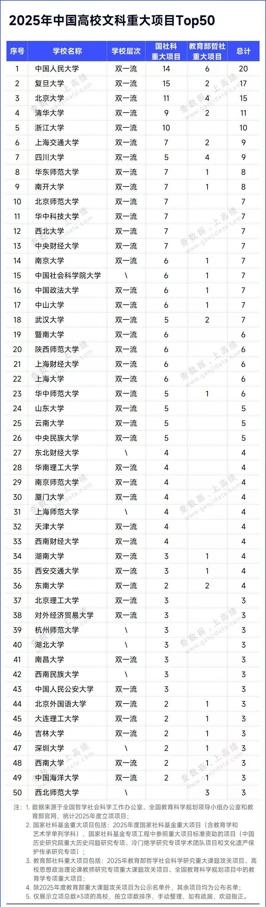 (数据说明:本文统计2025年度国家社科基金项目和教育部人文社科项目。国家社科基金项目包括:2025年度国家社科基金重大项目和年度项目(含教育学和艺术学单列学科),国家社科基金专项工程(包含中国历史研究院重大历史问题研究专项、高校思想政治理论课研究专项、冷门绝学研究专项、文化遗产保护传承研究专项),国家社科基金后期资助项目暨优秀博士论文出版项目、优秀学术著作再版项目,国家社科基金哲学社会科学学术通俗读物项目和中华学术外译项目;教育部人文社科项目包括:2025年教育部哲学社会科学研究重大课题攻关项目、高校思想政治理论课教师研究专项重大课题攻关项目、教育部人文社会科学研究一般项目、全国教育科学规划项目中教育学学科的教育部年度项目和专项项目。)