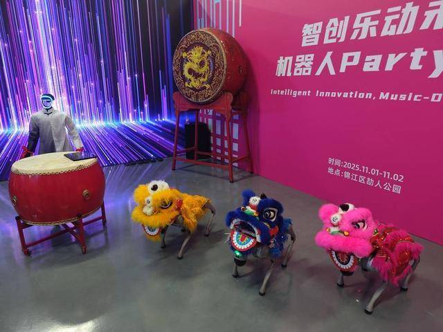 机器人鼓手奏响铿锵鼓点,四只机器狗化身“钢铁瑞兽”灵动起舞,摇头摆尾间再现传统舞狮的神韵。同时在现场,兴锦商司旗下原创IP“春熙六宝”萌趣人偶惊喜加盟,国潮熊猫与“醒狮团”默契配合,让川剧与舞狮两大非遗在科技赋能下焕发新彩。