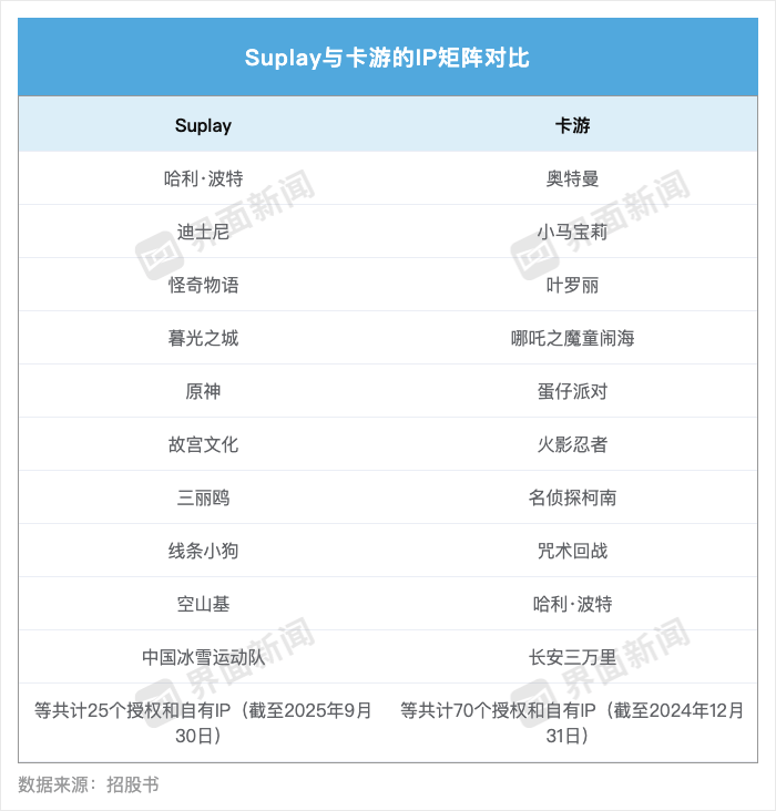 与泡泡玛特主要依靠自有IP不同,Suplay和卡游都是依赖于授权IP,但这两家公司的IP矩阵有所不同。
