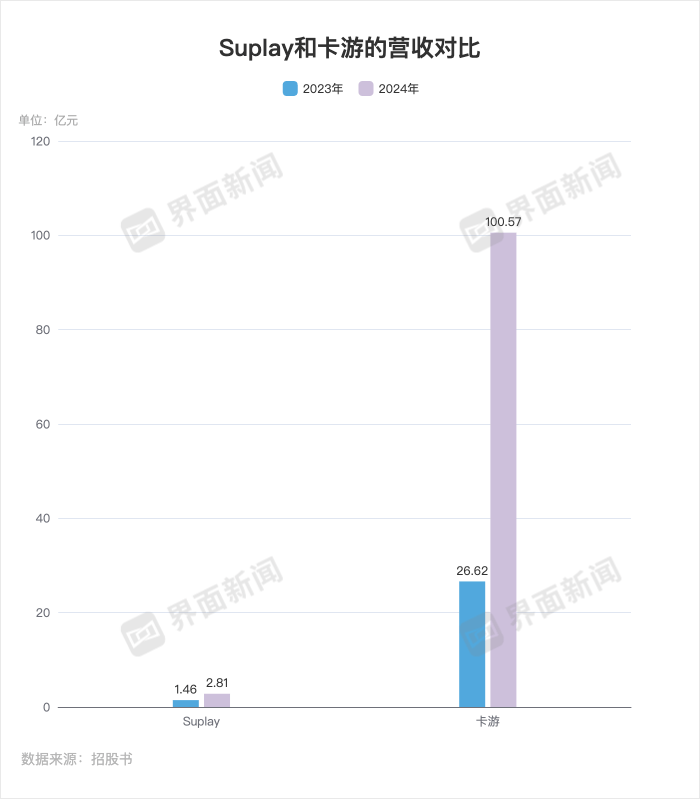 从营收规模上来说,Suplay和卡游还有数十倍的差距——2023年和2024年,Suplay的营收分别为1.46亿元和2.81亿元;而同期卡游的营收分别达到26.62亿元和100.57亿元。