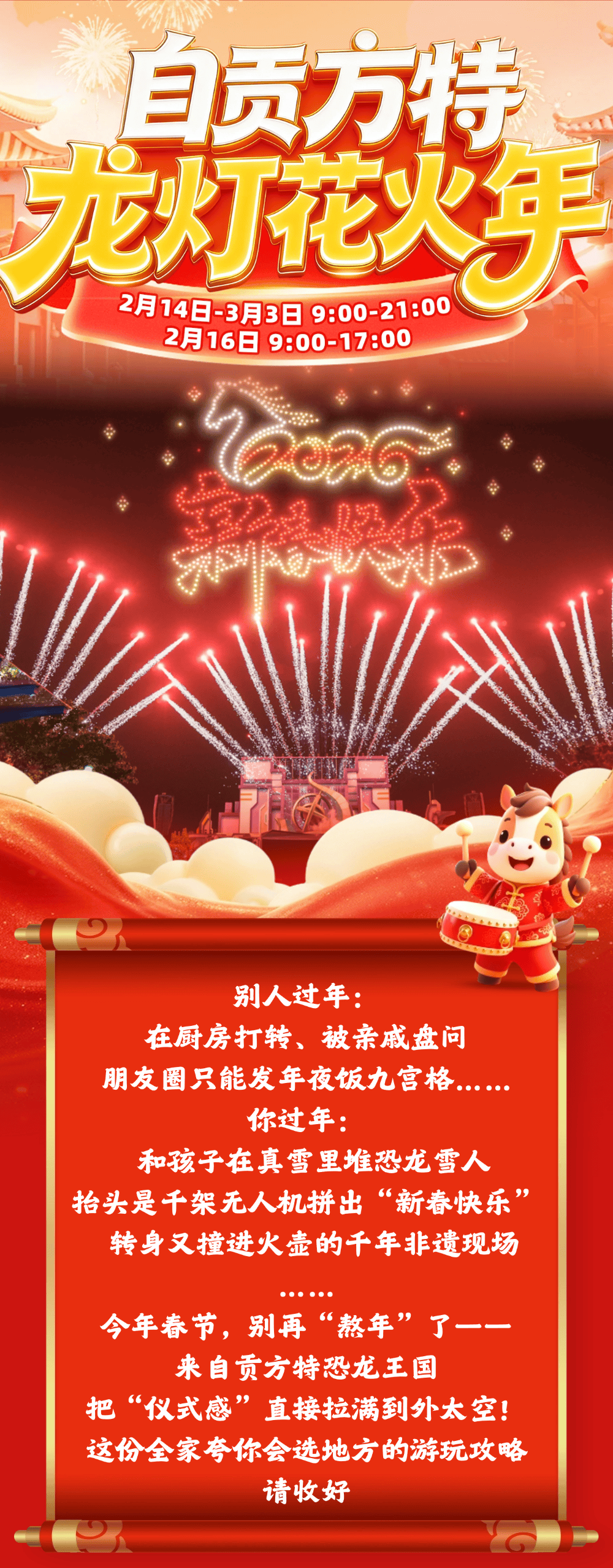 内容:每日38+主题项目畅玩,恐龙小镇新增5大新春美陈及NPC互动。祭祀广场千平真雪+彩灯融合沉浸式表演。夜间九大花车巡游、八大恐龙主题彩灯,火壶、火扇、火刀、喷火表演;主题夜场后千架无人机上演天幕龙马奔腾大秀及许愿树烟花秀。情人节期间特别推出甜美星空千架无人机秀及心形烟花秀。