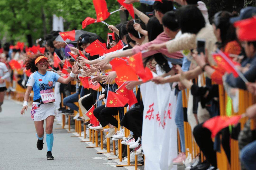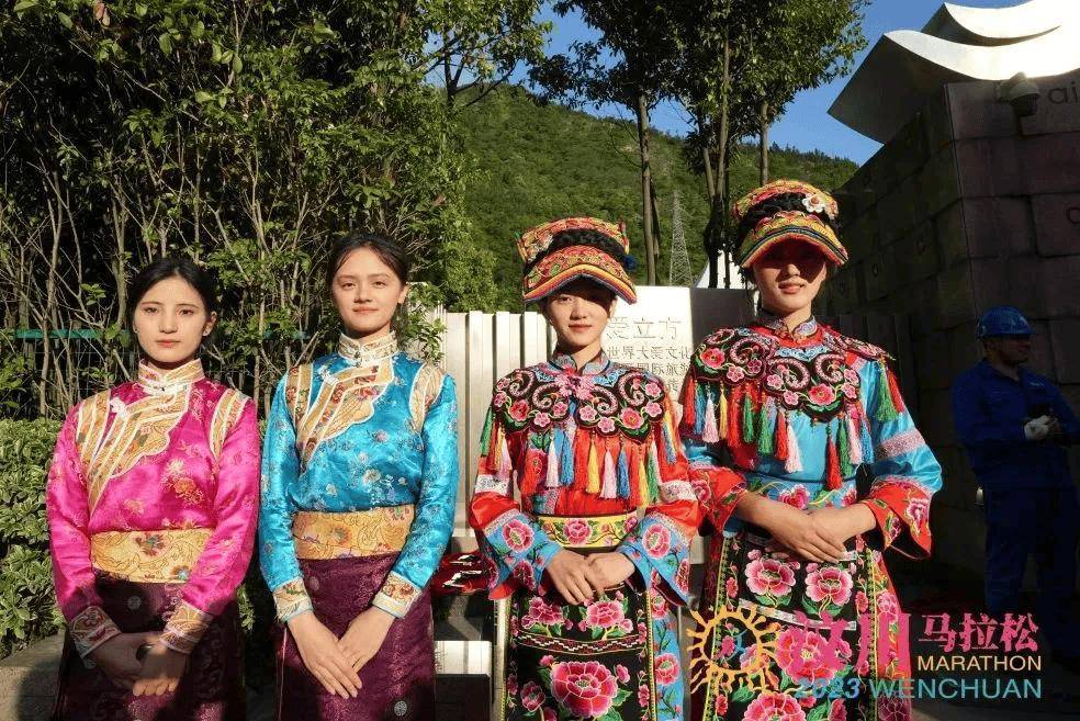 在汶川马拉松,你可以看见身着藏羌服饰的礼仪姑娘,服饰上的刺绣、图案、色彩都展示着丰富独特的民族文化。赛道上的公里指示牌处,也升级为特色打卡点,跑友们可以合影留念,记录下这份美好。