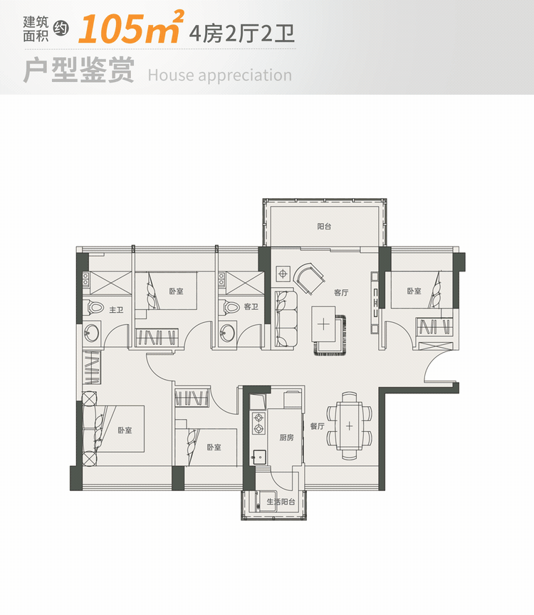 建面约105㎡4房2厅2卫是楼王单位,仅58套可售单位,能满足大部分家庭一步到位的需求。