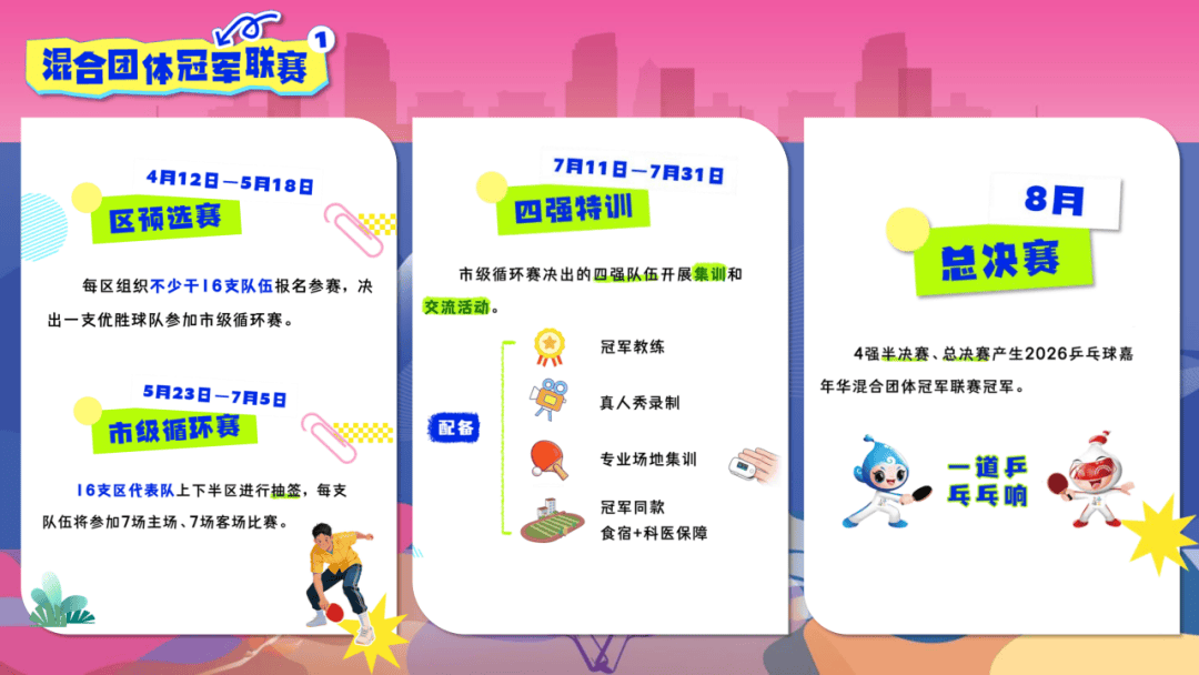 混合团体冠军联赛参照国际乒联混合团体世界杯赛制,设置混双、男单、女单、男双、女双5个场次,采用3局11分制、15局8胜制的比赛办法,每队允许2名专业运动员报名,所有运动员年龄上限为70周岁。分区预选赛、市级循环赛、总决赛三个阶段。