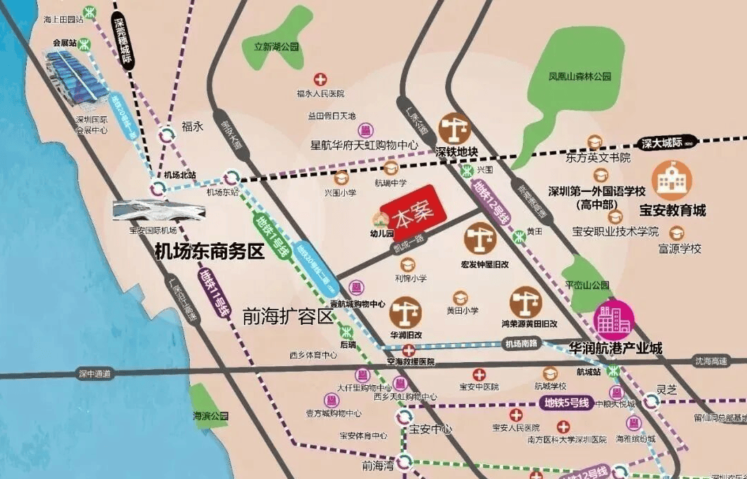 空铁新城机场东综合交通枢纽作为深圳建设国际航空枢纽与国家铁路枢纽的重要组成部分,集航空、高铁、城际、城市轨道、公交等多种交通方式于一体。目依托自身的交通优势。左连前海、右接会展。享受前海的金融利好辐射,又承载着会展的人流导入的功能。成是湾区三角中金融辐射、会展人流承载的核心地带