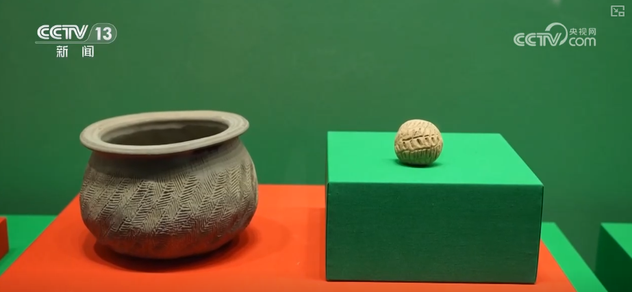 这是一件印有树叶脉络装饰的陶罐,在它旁边还有一件用来制作这种叶脉纹的工具,叫做“陶拍”。这些器物说明在几千年前,中国古代的先民们就已经开始用特制的工具来进行纹饰纹样的创作。