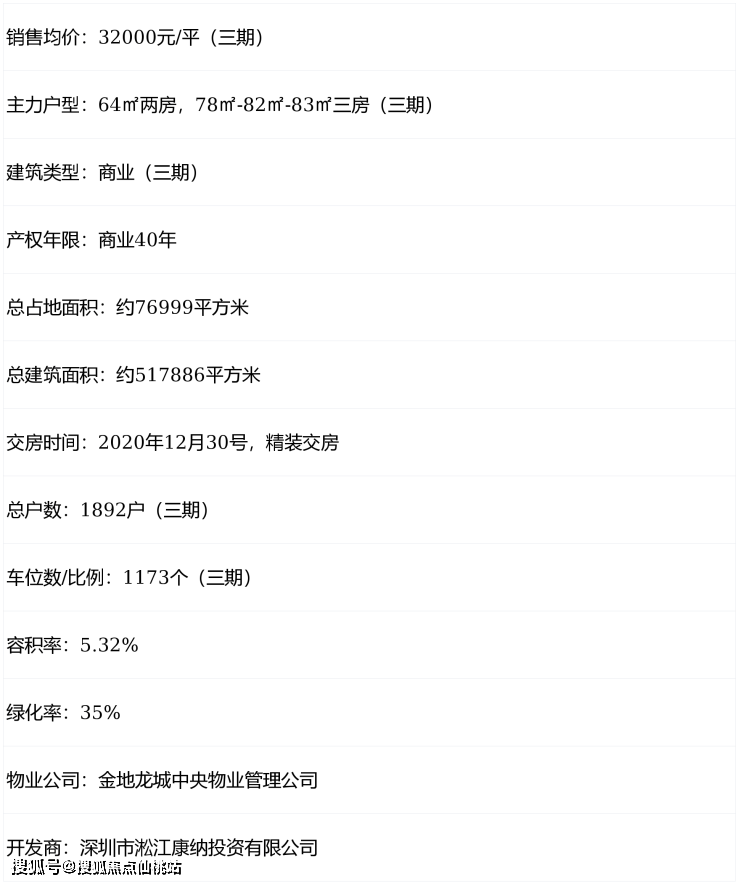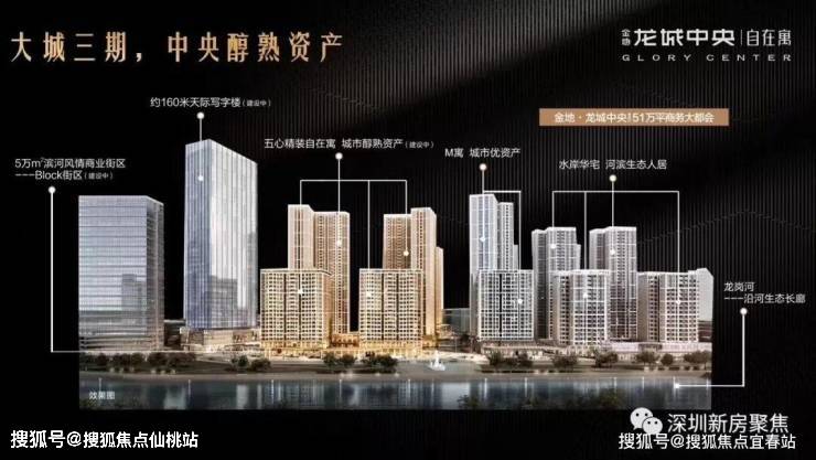 项目位于深圳市龙岗中心城,紧邻龙岗河,处于龙岗大道与龙城南路交界处,总占地面积约7.7万平方米,总建筑面积约51.7万平方米,物业类型涵括住宅、 、商业以及写字楼(160米)等多种形态。项目分三期开发,一期/二期已售罄,三期工程正全面开展,根据规划,三期由4座公寓1座写字楼共5座建筑围合而成,目前在售产品为商务公寓建面64㎡-83㎡两房/三房,A/B两座19层3梯16户,C/D两座39-40层,5梯20户。